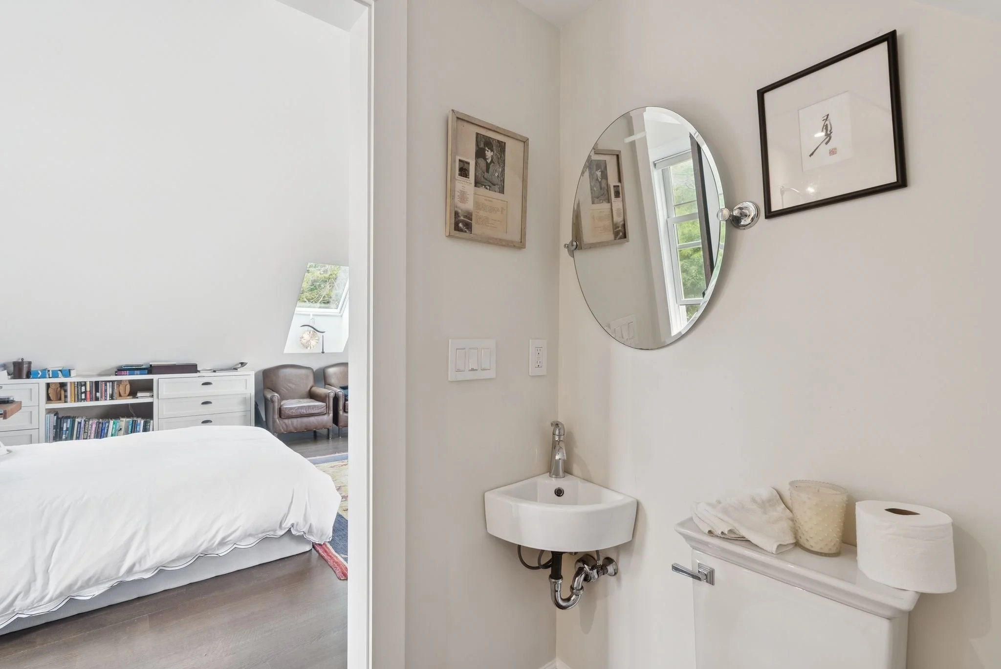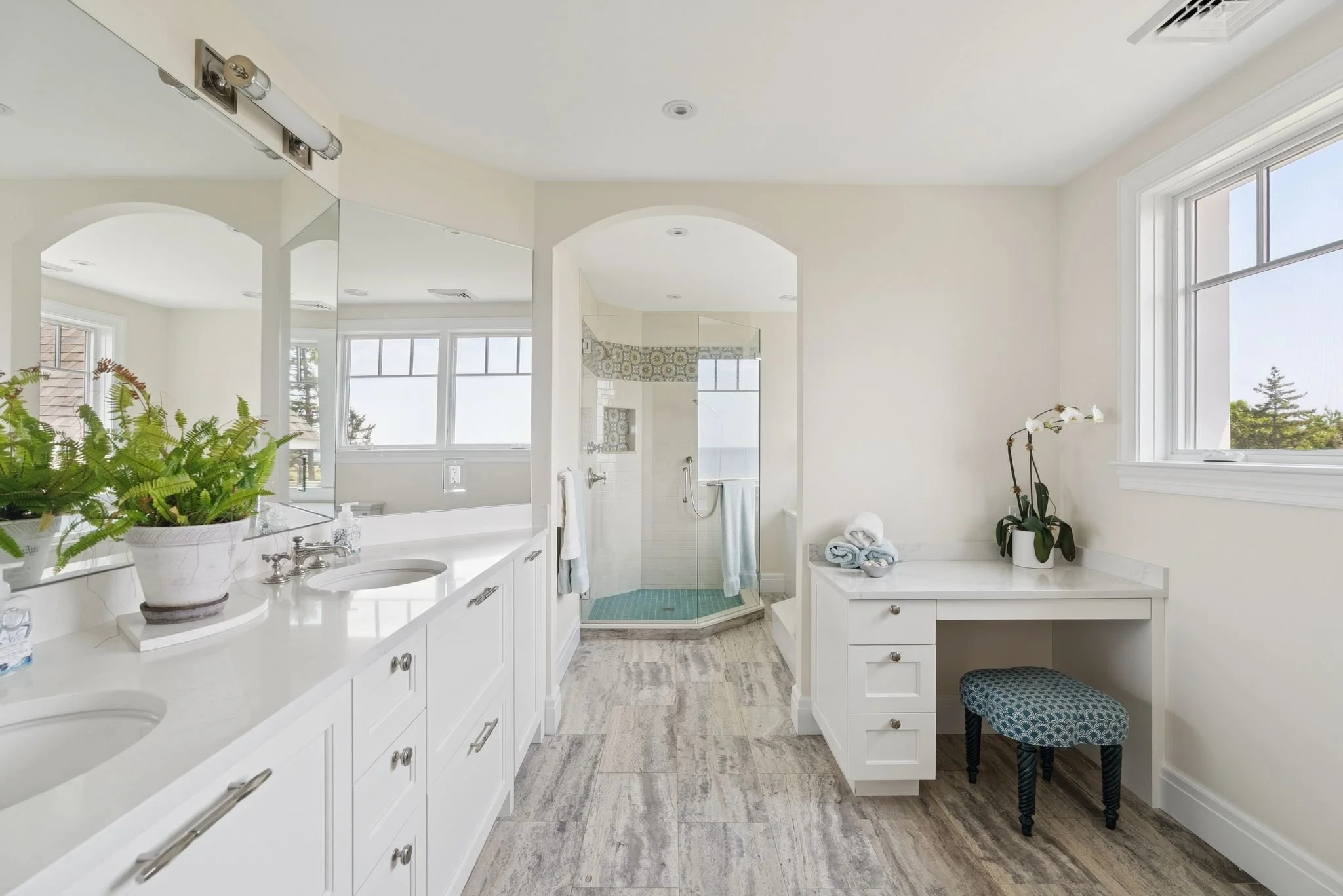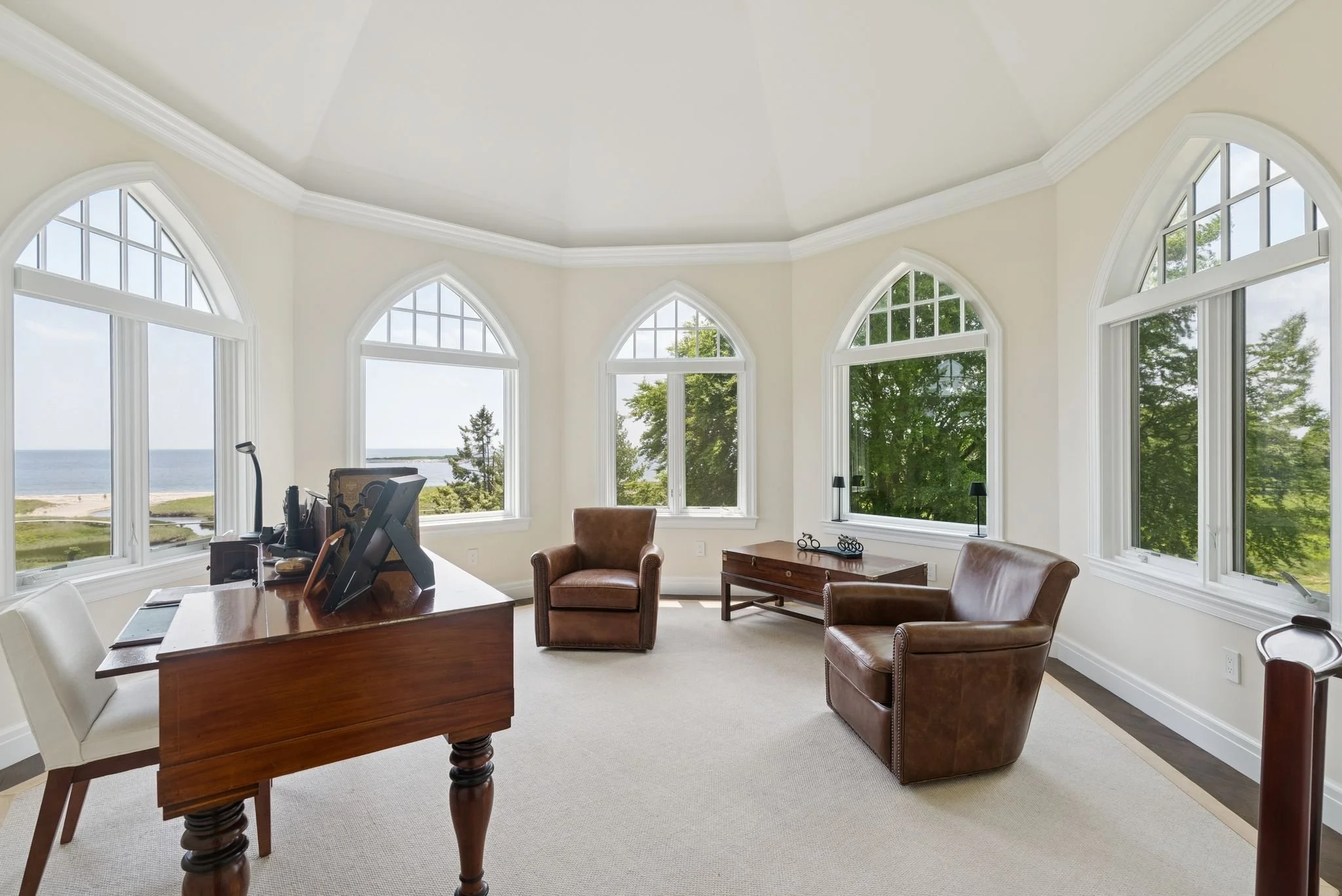 Architectural details elevate every corner of the home: arched windows, a turreted office with panoramic views, wide-plank wood flooring, and intricate millwork throughout. The luxurious primary suite includes dual walk-in closets, a spa-like bath with soaking tub and custom tile shower, and breathtaking ocean views. Upstairs, a spacious and light-filled guest suite with its own kitchenette and full bath provides an ideal space for extended stays or creative retreat.