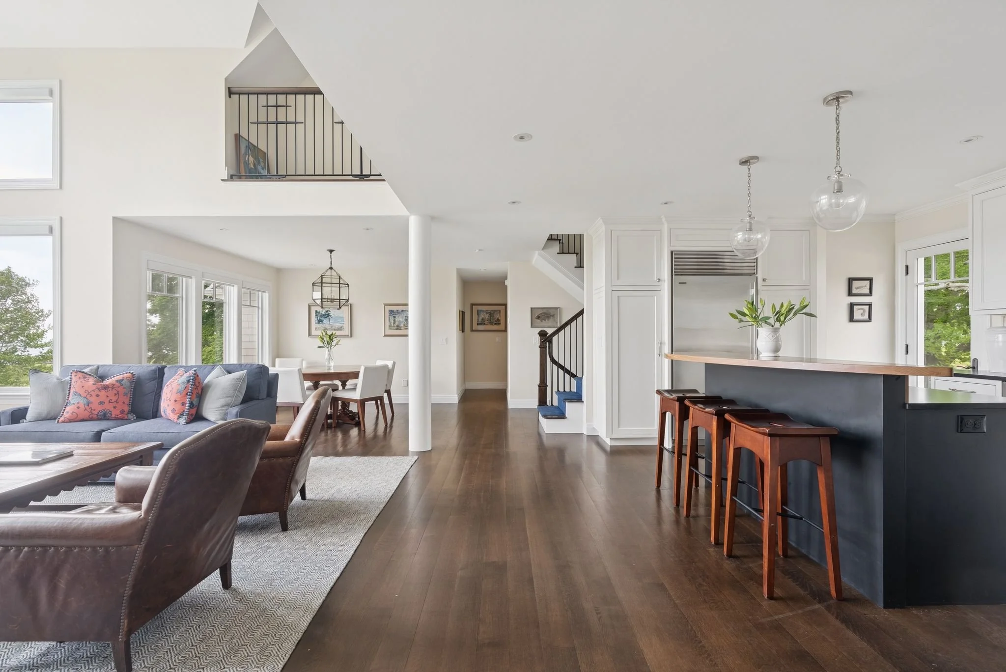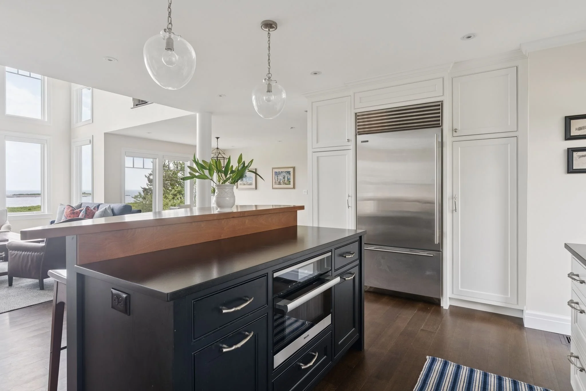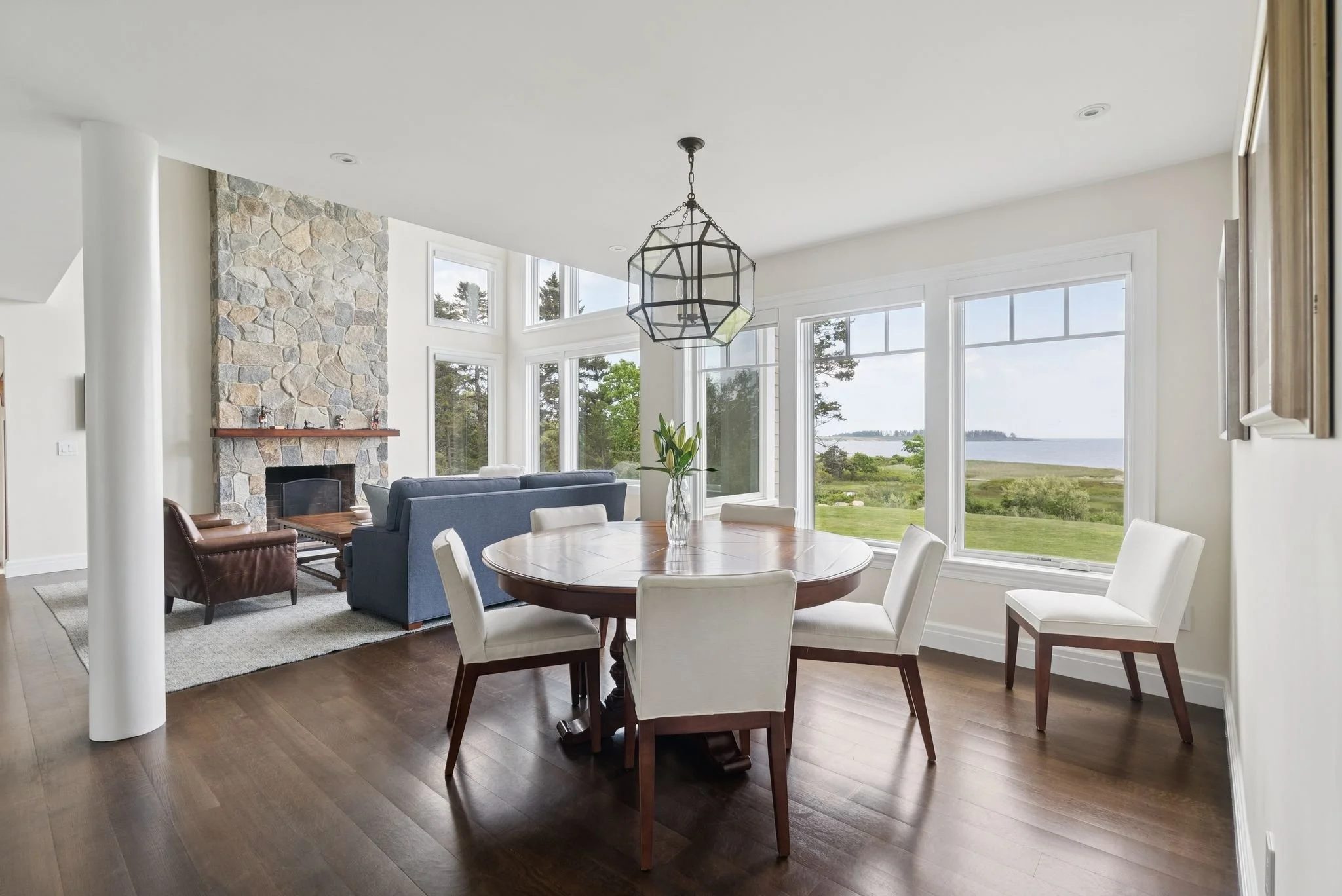 Set just above a winding stretch of sandy beach and tidal marshland, the home offers sweeping views of the Atlantic and Richmond Island from nearly every room. The main living space centers around a dramatic two-story great room with a floor-to-ceiling stone fireplace and walls of glass that bring the seascape in. The open kitchen flows into a casual sitting area and dining space—perfect for everyday living or entertaining at scale.