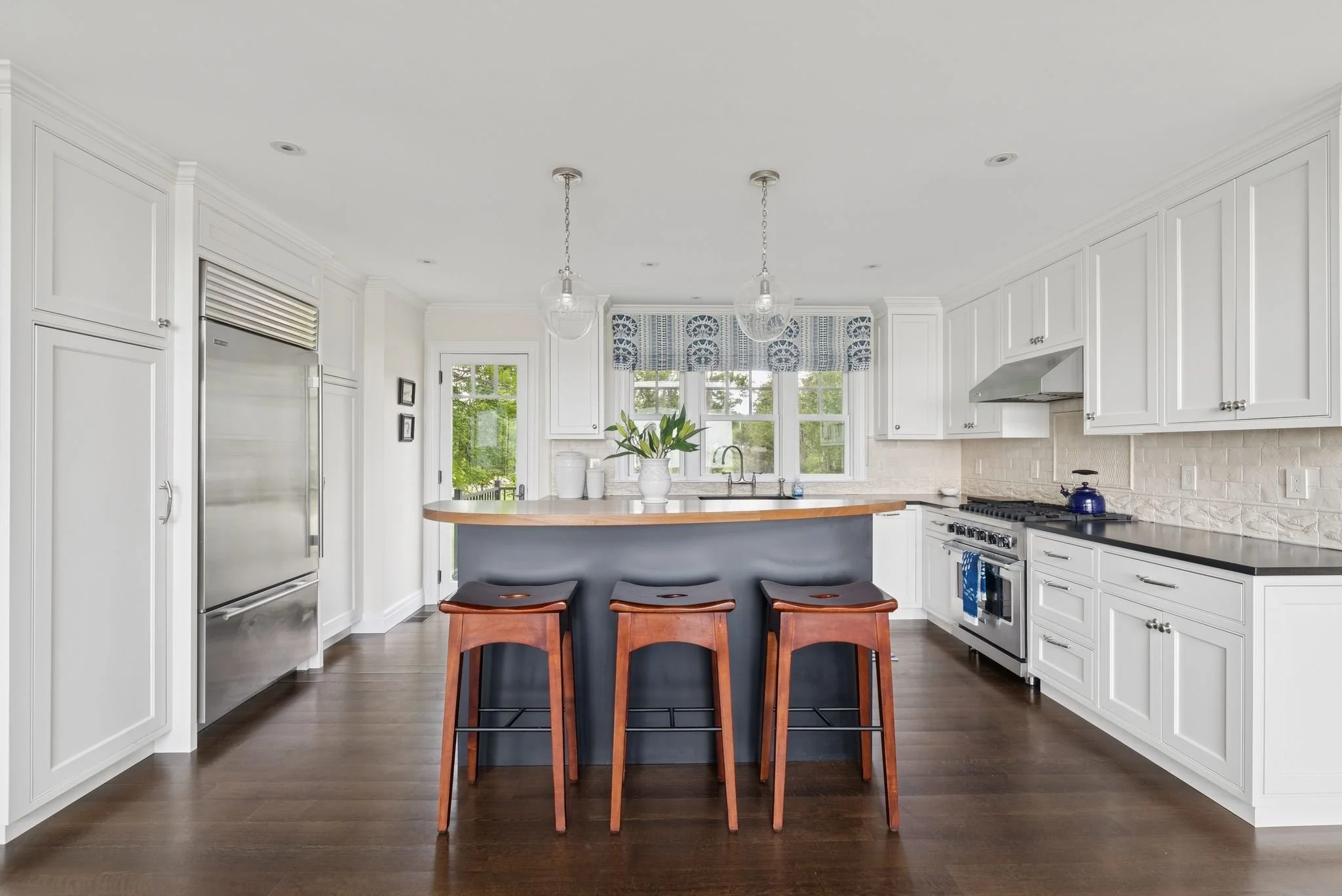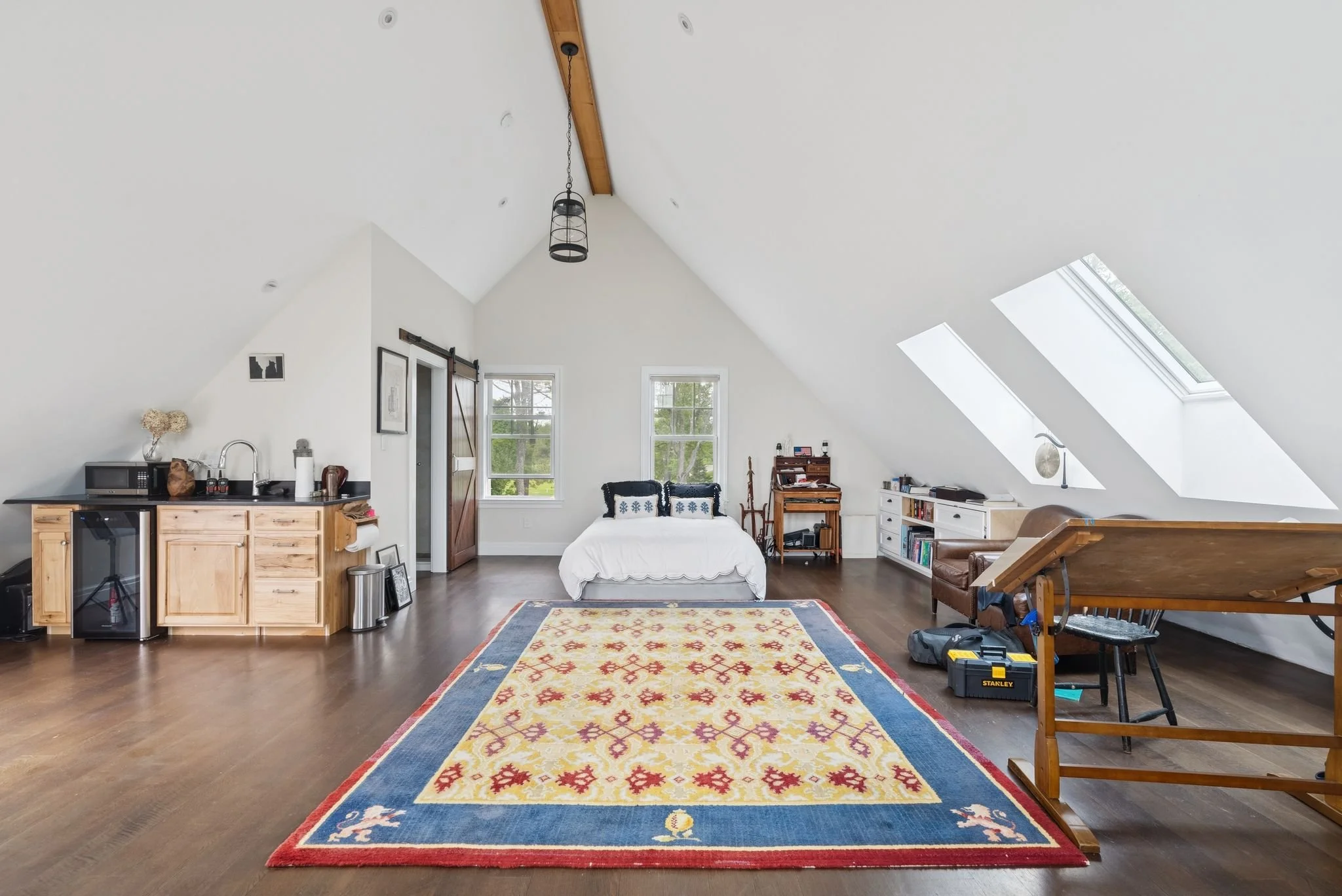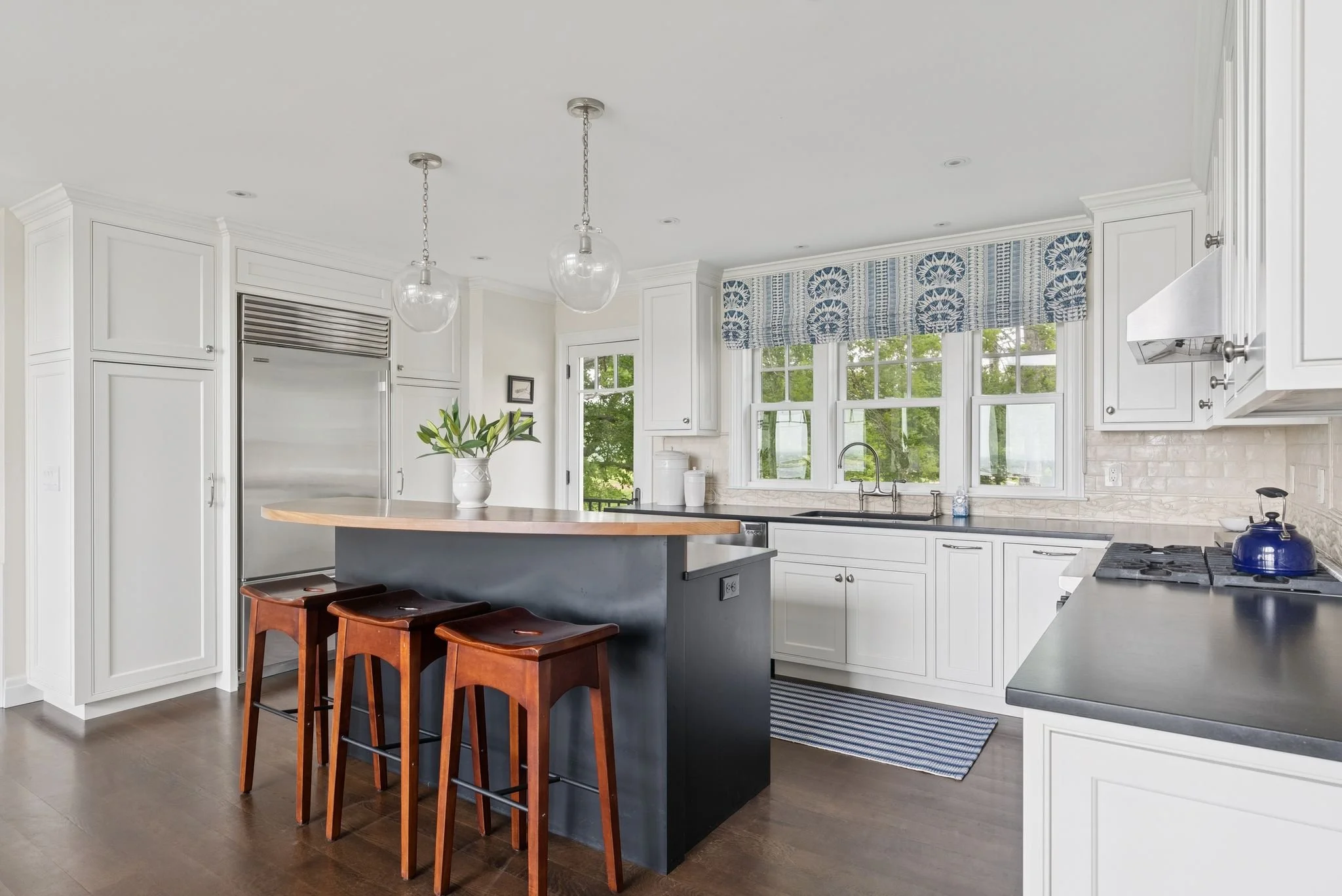 Set just above a winding stretch of sandy beach and tidal marshland, the home offers sweeping views of the Atlantic and Richmond Island from nearly every room. The main living space centers around a dramatic two-story great room with a floor-to-ceiling stone fireplace and walls of glass that bring the seascape in. The open kitchen flows into a casual sitting area and dining space—perfect for everyday living or entertaining at scale.