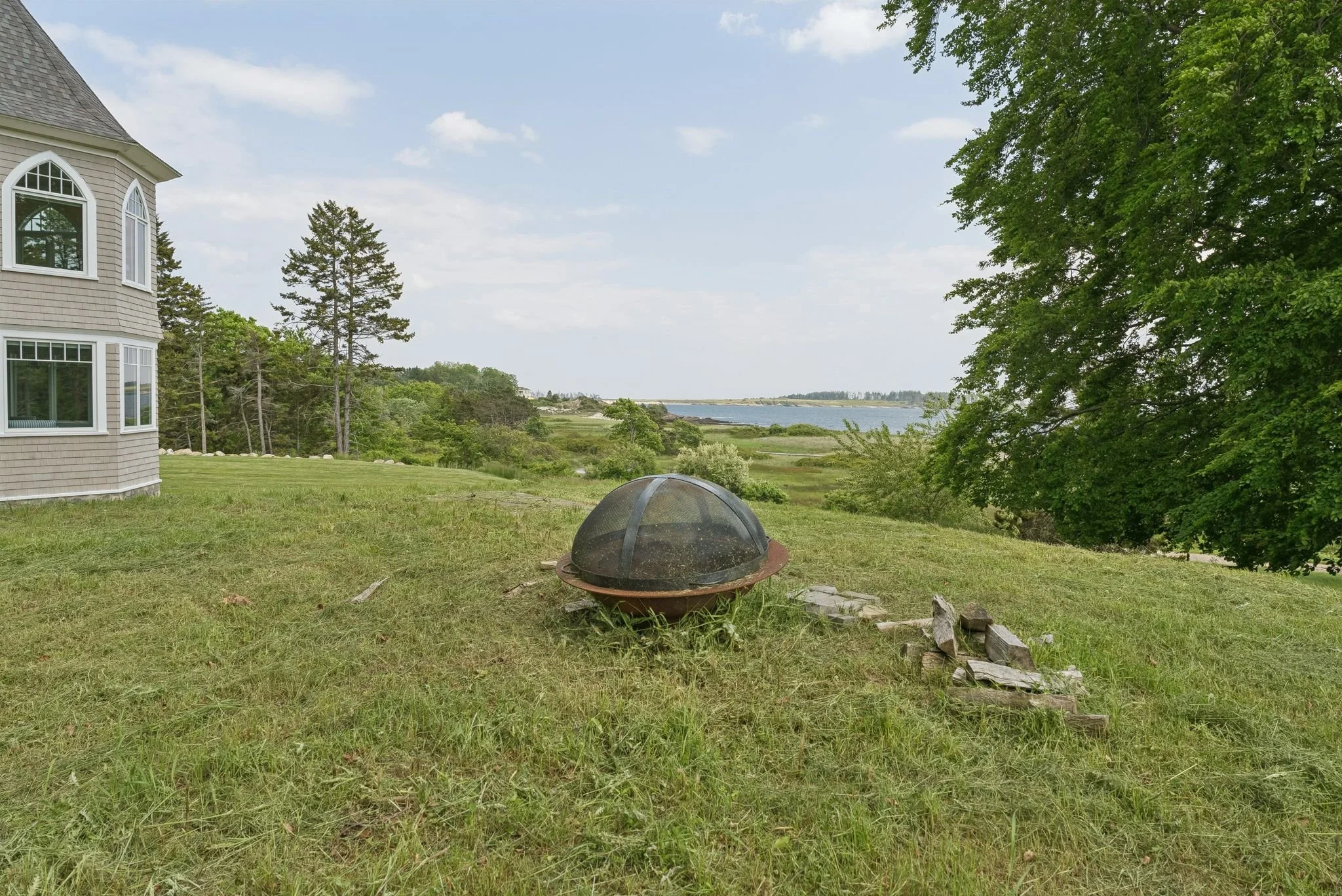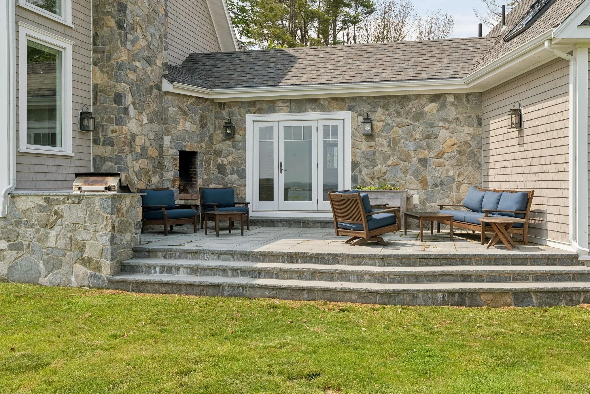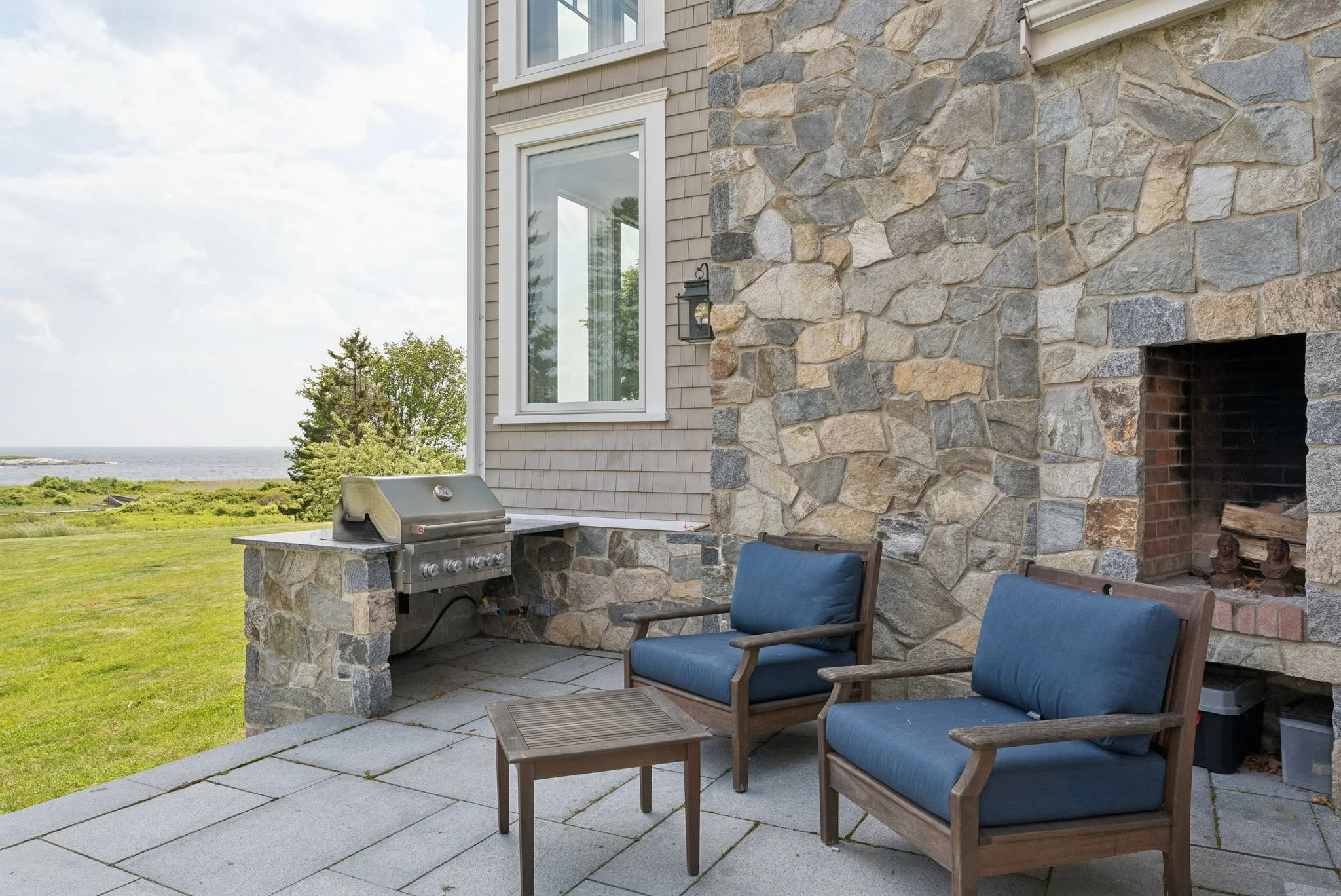 Outside, a stone patio with built-in grill, outdoor fireplace, and ample seating overlooks rolling lawn, oceanfront meadows, and miles of protected coastline.