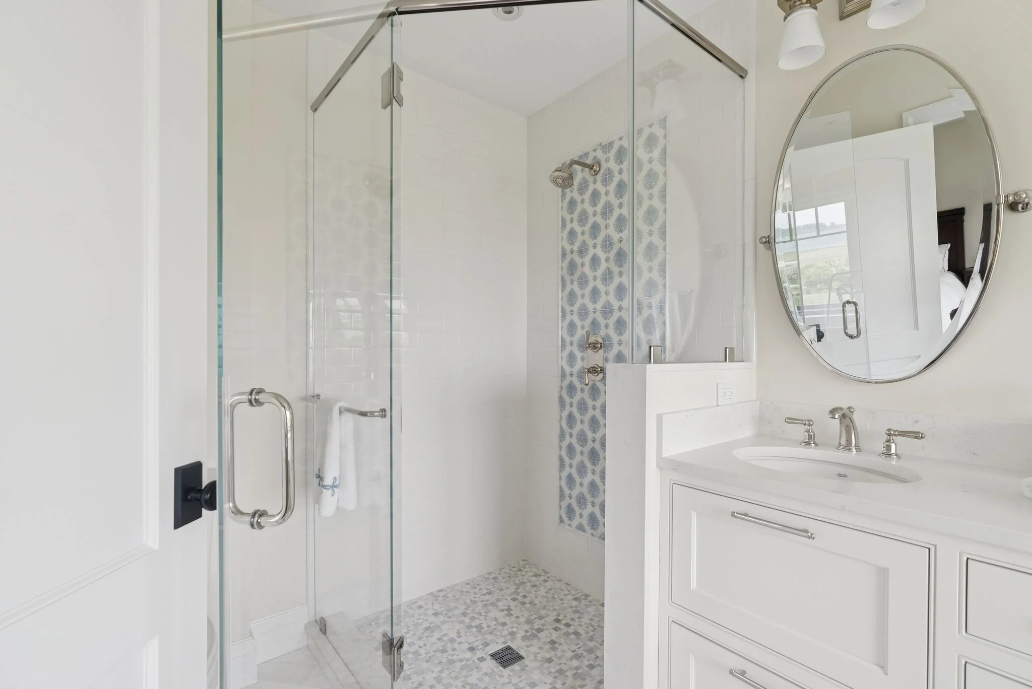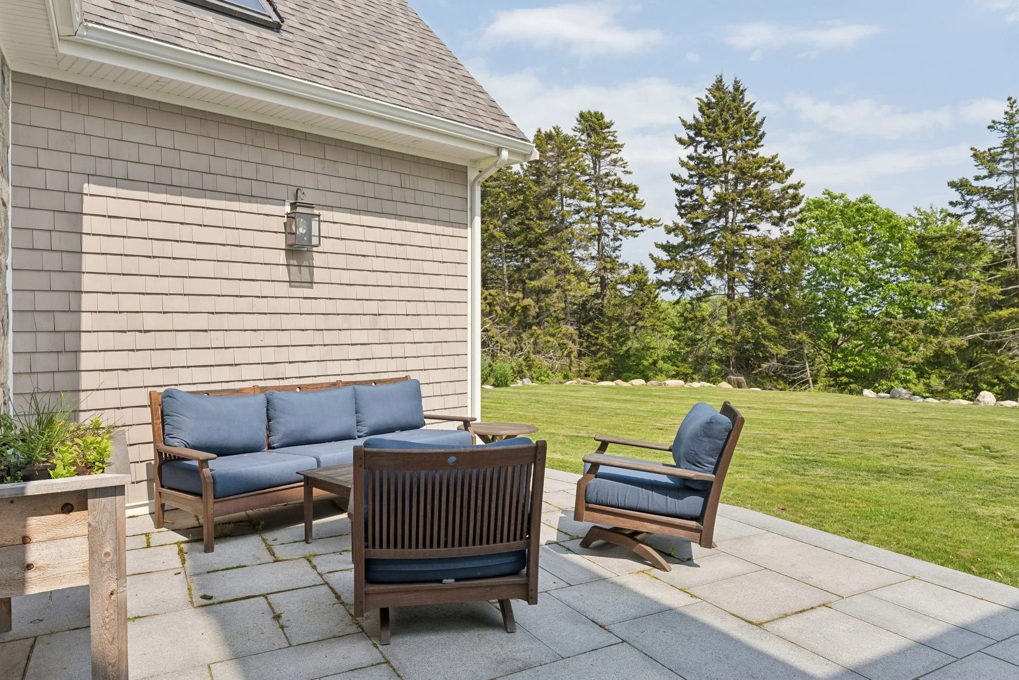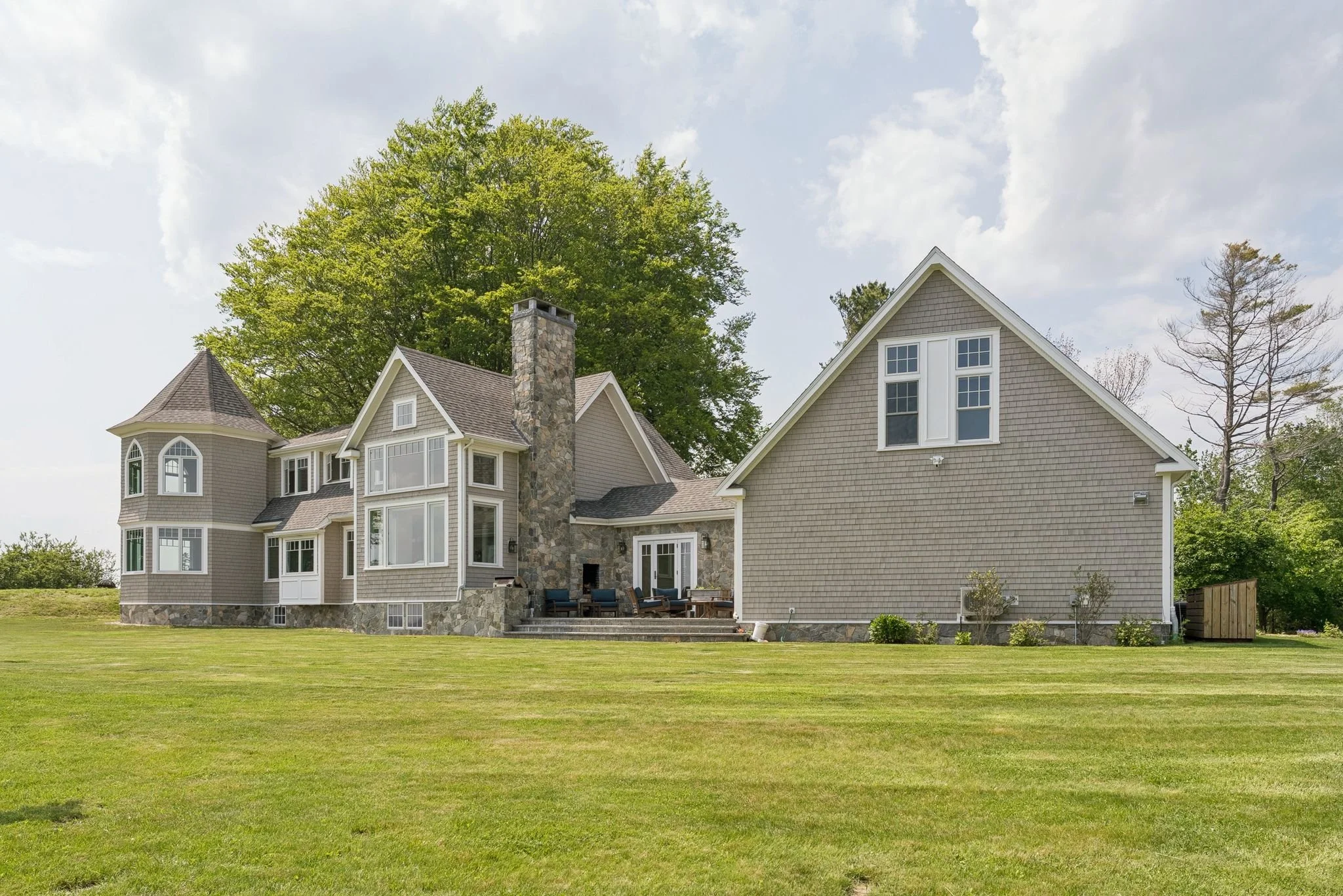 Outside, a stone patio with built-in grill, outdoor fireplace, and ample seating overlooks rolling lawn, oceanfront meadows, and miles of protected coastline.