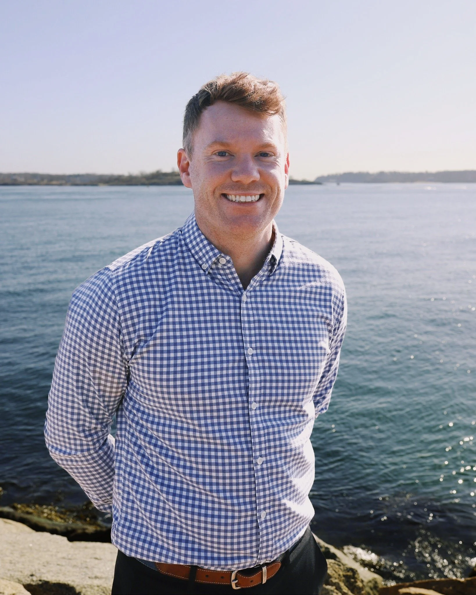 A smiling man standing outdoors by a body of water, wearing a checkered shirt.