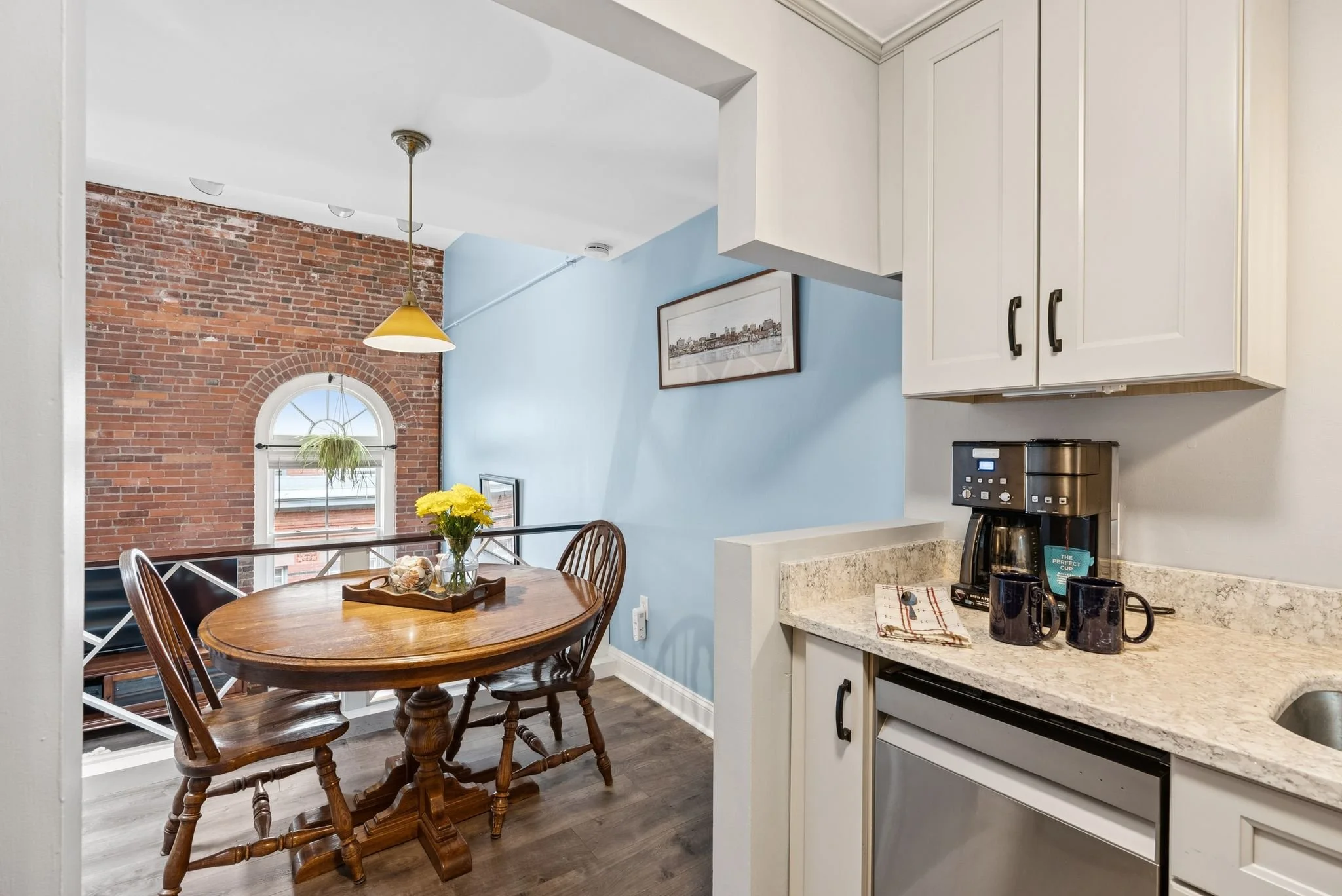 Exposed brick, a soaring arched window, and a dramatic skylight define the central living area, where 16'+ ceilings create incredible volume. The open layout connects the sunken living room with a charming dining area and an updated kitchen featuring shaker-style cabinets, granite countertops, stainless appliances, and modern lighting.